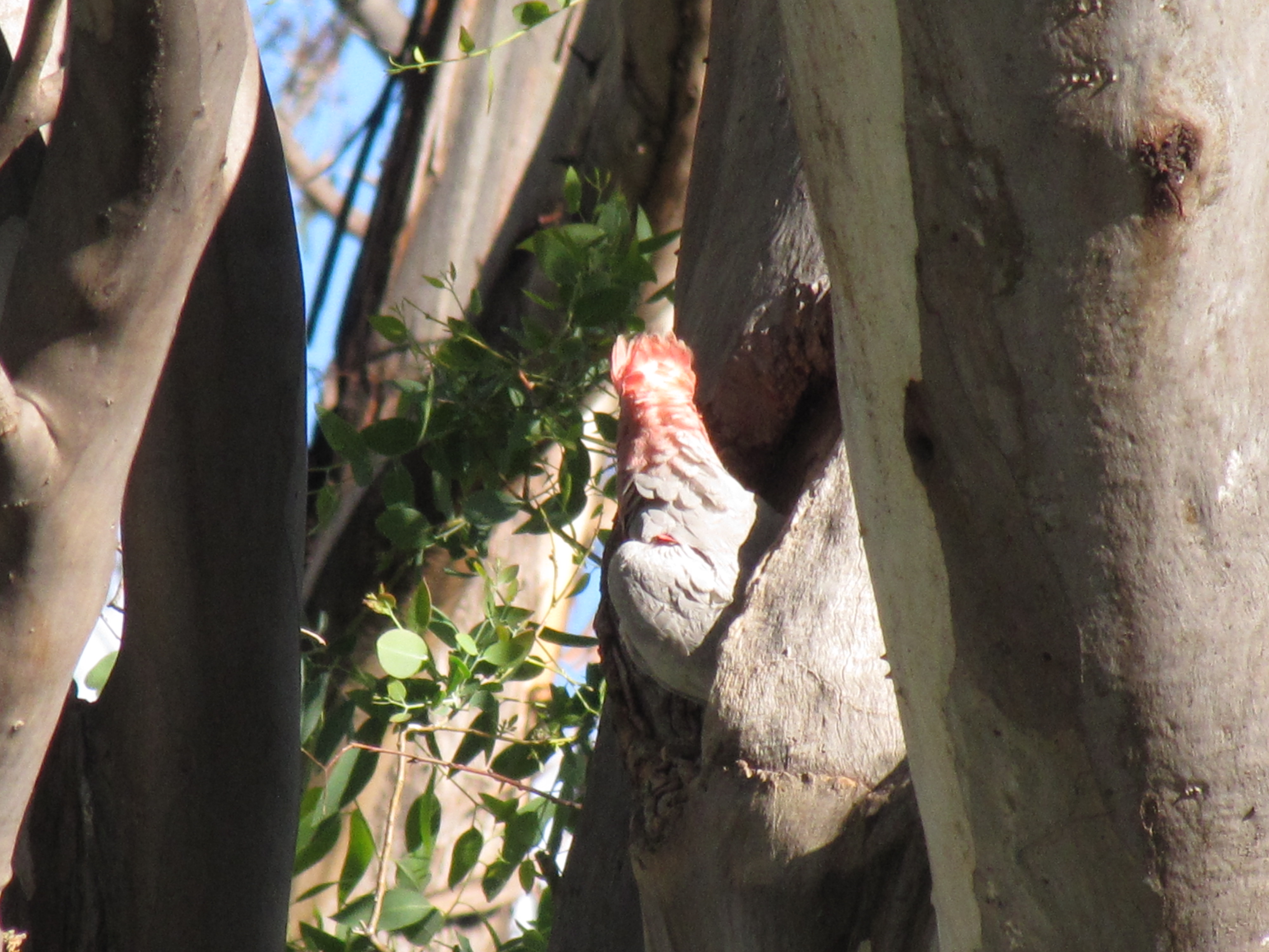 A pair of Galahs have been working at this hollow for some years. Then, about four years ago they started putting fresh eucalypt leaves in the hollow. I eagerly anticipated a nesting attempt but they abandoned their quest. About once or twice a day they would sit at the opening of the hollow and screech loudly into the hollow – then fly away.