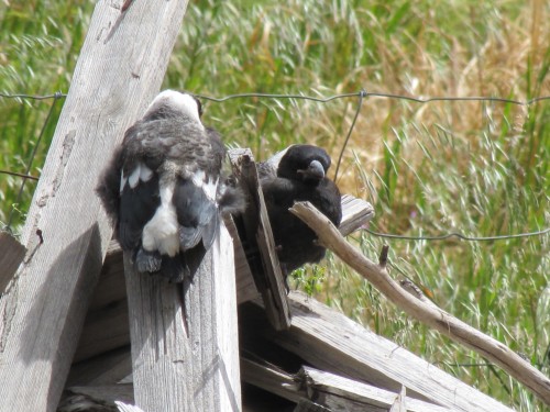 Baby Australian Magpies huddled against the wind
